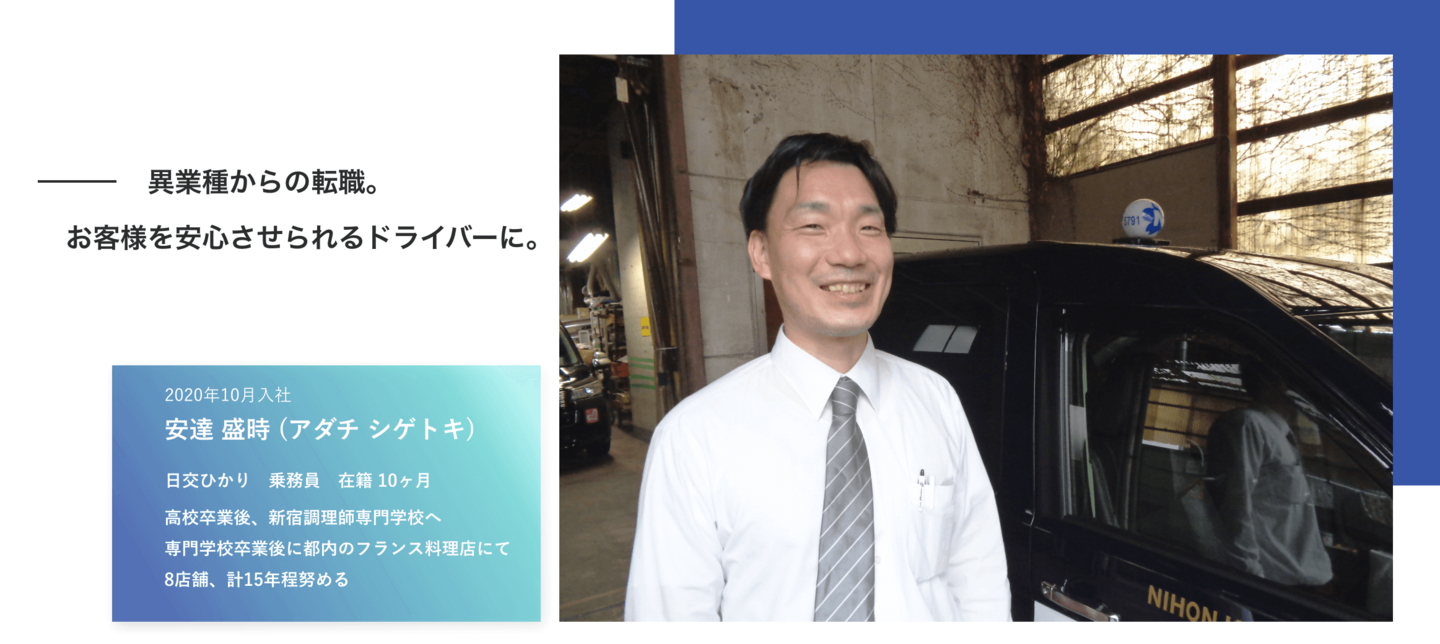 はい。現在はタクシーの乗務員として働いています。入社して約9ヶ月が経ちましたが、まだまだ仕事には慣れていない状態です。前職は、フランス料理店で働い